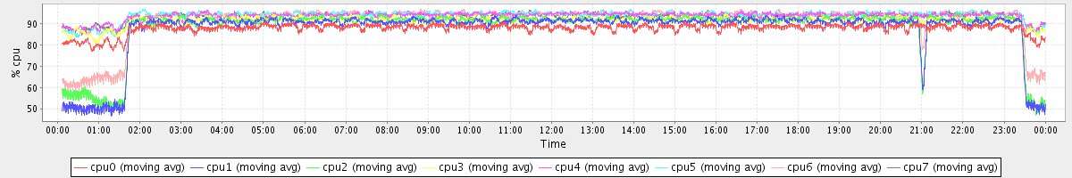 avg(cpu0) = 87.97 avg(cpu1) = 87.38 avg(cpu2) = 88.49 avg(cpu3) = 91.67 avg(cpu4) = 93.73 avg(cpu5) = 93.97 avg(cpu6) = 91.78 avg(cpu7) = 93.45