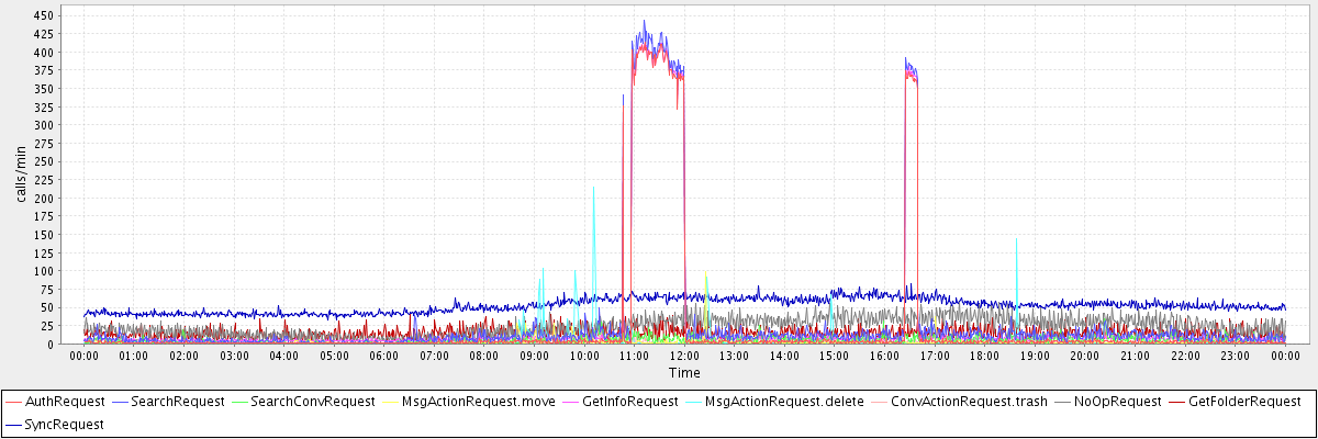 max(AuthRequest) = 413.00 max(SearchRequest) = 443.00 max(SearchConvRequest) = 34.00 max(MsgActionRequest.move) = 99.00 max(GetInfoRequest) = 413.00 max(MsgActionRequest.delete) = 215.00 max(ConvActionRequest.trash) = 21.00 max(NoOpRequest) = 57.00 max(GetFolderRequest) = 45.00 max(SyncRequest) = 82.00