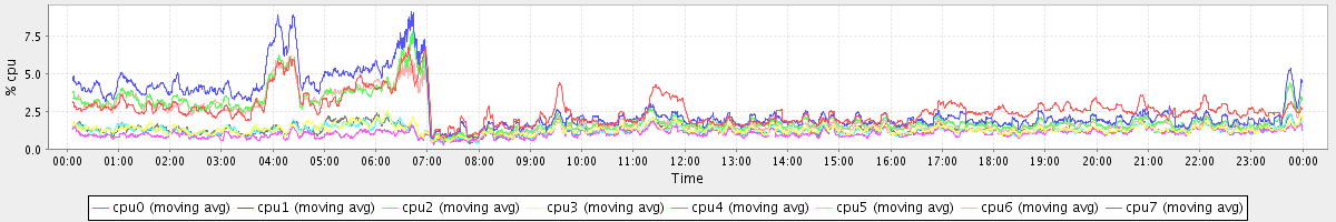 avg(cpu0) = 2.66 avg(cpu1) = 0.65 avg(cpu2) = 0.56 avg(cpu3) = 0.45 avg(cpu4) = 0.33 avg(cpu5) = 0.40 avg(cpu6) = 0.54 avg(cpu7) = 0.43