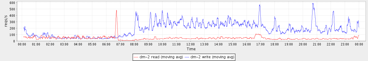 avg(dm-1 read) = 37.74 avg(dm-1 write) = 830.36