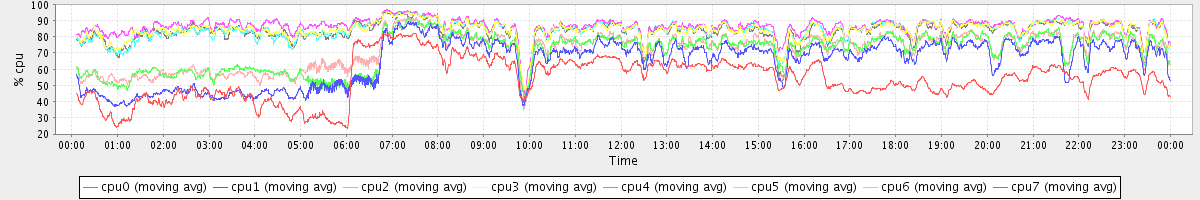 avg(cpu0) = 54.02 avg(cpu1) = 64.81 avg(cpu2) = 70.88 avg(cpu3) = 84.22 avg(cpu4) = 86.37 avg(cpu5) = 84.10 avg(cpu6) = 71.37 avg(cpu7) = 83.30