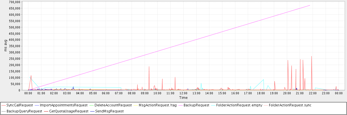 avg(SyncGalRequest) = 5087.59 avg(ImportAppointmentsRequest) = 952.00 avg(DeleteAccountRequest) = 829.00 avg(MsgActionRequest.!tag) = 966.83 avg(BackupRequest) = 337017.50 avg(FolderActionRequest.empty) = 6182.40 avg(FolderActionRequest.sync) = 16850.00 avg(BackupQueryRequest) = 990.60 avg(GetQuotaUsageRequest) = 3307.00 avg(SendMsgRequest) = 710.74
