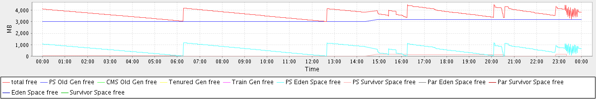 avg(total free) = 3725.37 avg(PS Old Gen free) = 3092.53 avg(CMS Old Gen free) = 0.00 avg(Tenured Gen free) = 0.00 avg(Train Gen free) = 0.00 avg(PS Eden Space free) = 588.63 avg(PS Survivor Space free) = 44.21 avg(Par Eden Space free) = 0.00 avg(Par Survivor Space free) = 0.00 avg(Eden Space free) = 0.00 avg(Survivor Space free) = 0.00
