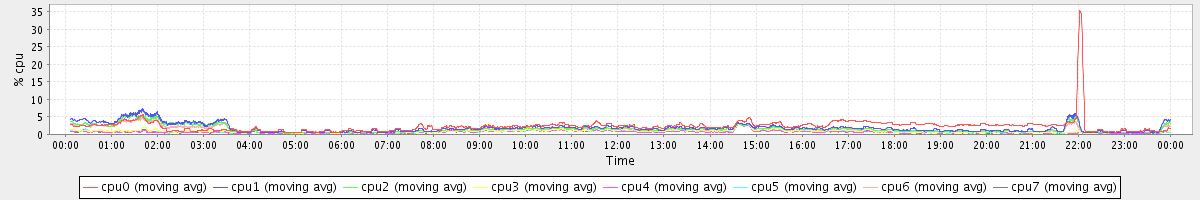 avg(cpu0) = 1.34 avg(cpu1) = 0.27 avg(cpu2) = 0.24 avg(cpu3) = 0.13 avg(cpu4) = 0.09 avg(cpu5) = 0.10 avg(cpu6) = 0.20 avg(cpu7) = 0.11