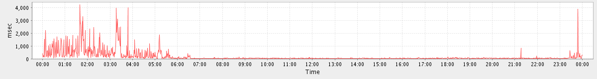 avg(AutoCompleteGalRequest) = 1205.61 avg(SyncGalRequest) = 3716.14 avg(ImportAppointmentsRequest) = 17172.00 avg(SearchGalRequest) = 1036.14 avg(DeleteAccountRequest) = 67801.50 avg(ModifyTaskRequest) = 502.00 avg(BackupRequest) = 426082.00 avg(FolderActionRequest.empty) = 5818.00 avg(BackupQueryRequest) = 1106.20 avg(GetQuotaUsageRequest) = 3284.00
