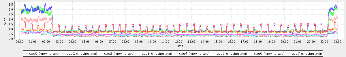 avg(cpu0) = 0.91 avg(cpu1) = 1.14 avg(cpu2) = 1.07 avg(cpu3) = 0.72 avg(cpu4) = 0.51 avg(cpu5) = 0.43 avg(cpu6) = 0.52 avg(cpu7) = 0.33
