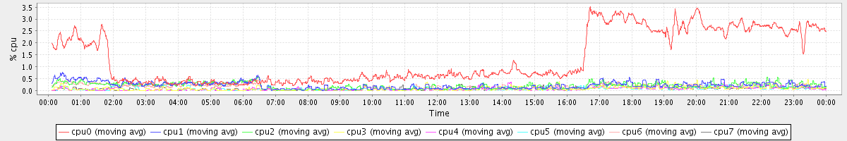 avg(cpu0) = 1.33 avg(cpu1) = 0.22 avg(cpu2) = 0.20 avg(cpu3) = 0.08 avg(cpu4) = 0.07 avg(cpu5) = 0.07 avg(cpu6) = 0.16 avg(cpu7) = 0.07