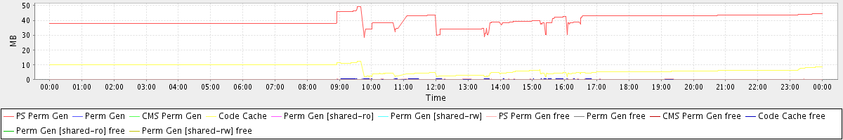 avg(PS Perm Gen) = 40.03 avg(Perm Gen) = 0.00 avg(CMS Perm Gen) = 0.00 avg(Code Cache) = 6.96 avg(Perm Gen [shared-ro]) = 0.00 avg(Perm Gen [shared-rw]) = 0.00 avg(PS Perm Gen free) = 0.11 avg(Perm Gen free) = 0.00 avg(CMS Perm Gen free) = 0.00 avg(Code Cache free) = 0.08 avg(Perm Gen [shared-ro] free) = 0.00 avg(Perm Gen [shared-rw] free) = 0.00