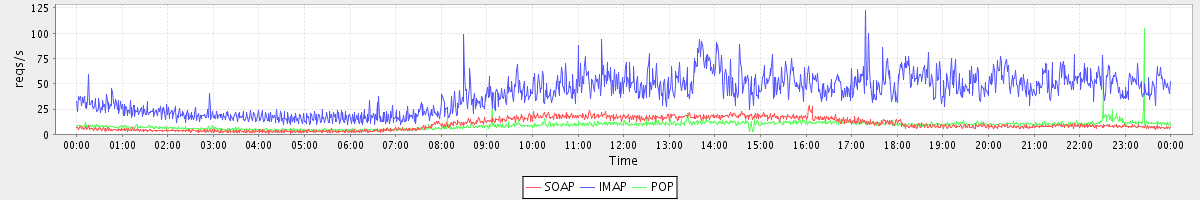 Host zm03.stanford.edu: Mailboxd: Request Rate by Client Protocol