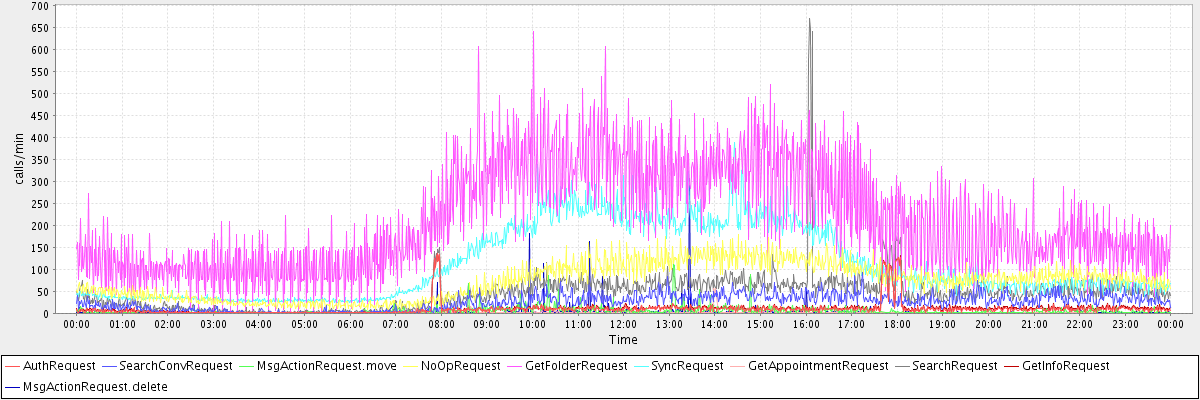 max(AuthRequest) = 136.00 max(SearchConvRequest) = 92.00 max(MsgActionRequest.move) = 111.00 max(NoOpRequest) = 179.00 max(GetFolderRequest) = 641.00 max(SyncRequest) = 390.00 max(GetAppointmentRequest) = 57.00 max(SearchRequest) = 671.00 max(GetInfoRequest) = 136.00 max(MsgActionRequest.delete) = 306.00