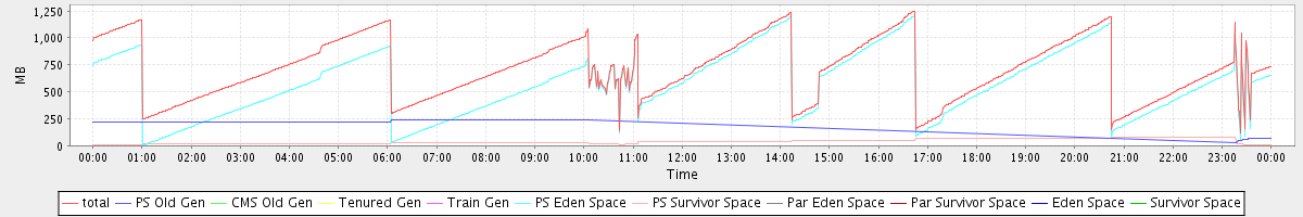 avg(total) = 711.52 avg(PS Old Gen) = 99.75 avg(CMS Old Gen) = 0.00 avg(Tenured Gen) = 0.00 avg(Train Gen) = 0.00 avg(PS Eden Space) = 572.57 avg(PS Survivor Space) = 39.20 avg(Par Eden Space) = 0.00 avg(Par Survivor Space) = 0.00 avg(Eden Space) = 0.00 avg(Survivor Space) = 0.00