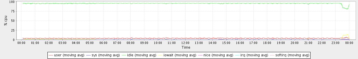 avg(user) = 3.62 avg(sys) = 0.26 avg(idle) = 95.67 avg(iowait) = 0.43 avg(nice) = 0.00 avg(irq) = 0.00 avg(softirq) = 0.00