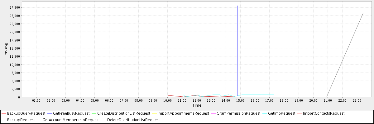 avg(BackupQueryRequest) = 405.00 avg(GetFreeBusyRequest) = 14235.50 avg(CreateDistributionListRequest) = 606.00 avg(ImportAppointmentsRequest) = 21777.00 avg(GrantPermissionRequest) = 356.00 avg(GetInfoRequest) = 454.50 avg(ImportContactsRequest) = 21455.00 avg(BackupRequest) = 13016.00 avg(GetAccountMembershipRequest) = 280.33 avg(DeleteDistributionListRequest) = 1257.00