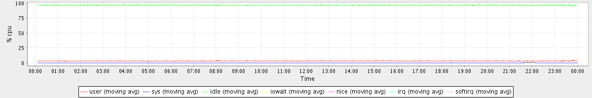 avg(user) = 3.16 avg(sys) = 0.22 avg(idle) = 96.59 avg(iowait) = 0.01 avg(nice) = 0.00 avg(irq) = 0.00 avg(softirq) = 0.00