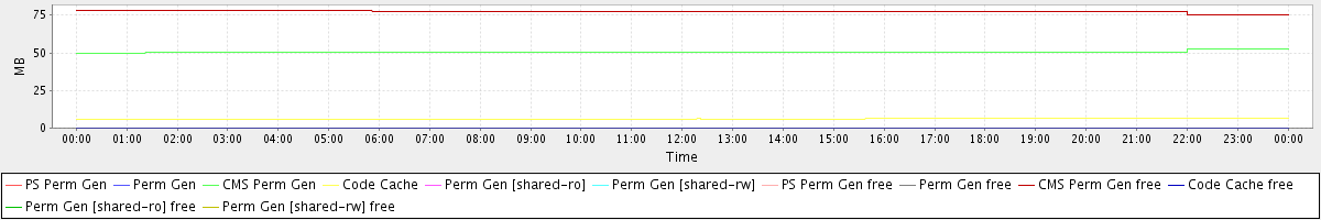 avg(PS Perm Gen) = 0.00 avg(Perm Gen) = 0.00 avg(CMS Perm Gen) = 50.41 avg(Code Cache) = 6.17 avg(Perm Gen [shared-ro]) = 0.00 avg(Perm Gen [shared-rw]) = 0.00 avg(PS Perm Gen free) = 0.00 avg(Perm Gen free) = 0.00 avg(CMS Perm Gen free) = 77.59 avg(Code Cache free) = 0.13 avg(Perm Gen [shared-ro] free) = 0.00 avg(Perm Gen [shared-rw] free) = 0.00