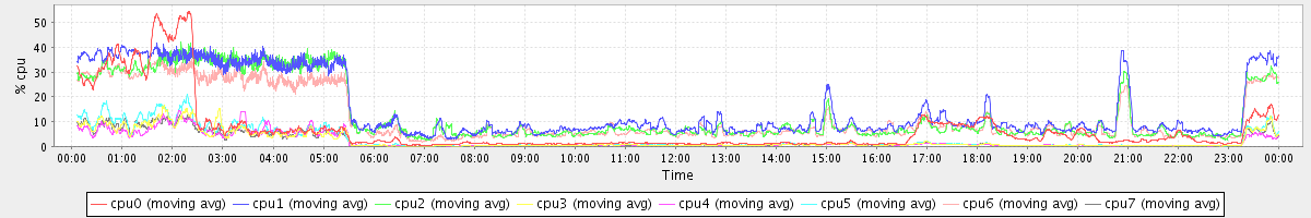 avg(cpu0) = 0.26 avg(cpu1) = 0.09 avg(cpu2) = 0.08 avg(cpu3) = 0.00 avg(cpu4) = 0.00 avg(cpu5) = 0.00 avg(cpu6) = 0.06 avg(cpu7) = 0.00