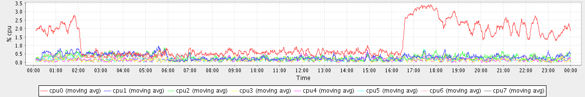 avg(cpu0) = 1.21 avg(cpu1) = 0.32 avg(cpu2) = 0.30 avg(cpu3) = 0.15 avg(cpu4) = 0.14 avg(cpu5) = 0.16 avg(cpu6) = 0.25 avg(cpu7) = 0.15