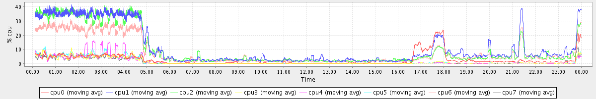 avg(cpu0) = 17.87 avg(cpu1) = 6.25 avg(cpu2) = 5.47 avg(cpu3) = 5.25 avg(cpu4) = 3.80 avg(cpu5) = 4.17 avg(cpu6) = 5.39 avg(cpu7) = 4.44