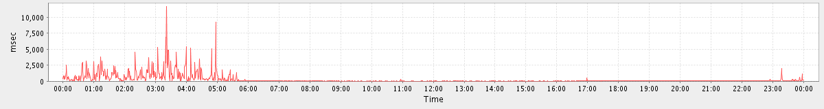 avg(SyncGalRequest) = 814.27 avg(BackupQueryRequest) = 361.40 avg(MaintainTablesRequest) = 146106.00 avg(GetQuotaUsageRequest) = 3260.00 avg(MsgActionRequest.spam) = 296.50 avg(ContactActionRequest.move) = 493.67 avg(DeleteAccountRequest) = 4028.00 avg(SendMsgRequest) = 303.51 avg(BackupRequest) = 311498.50 avg(FolderActionRequest.empty) = 1637.40