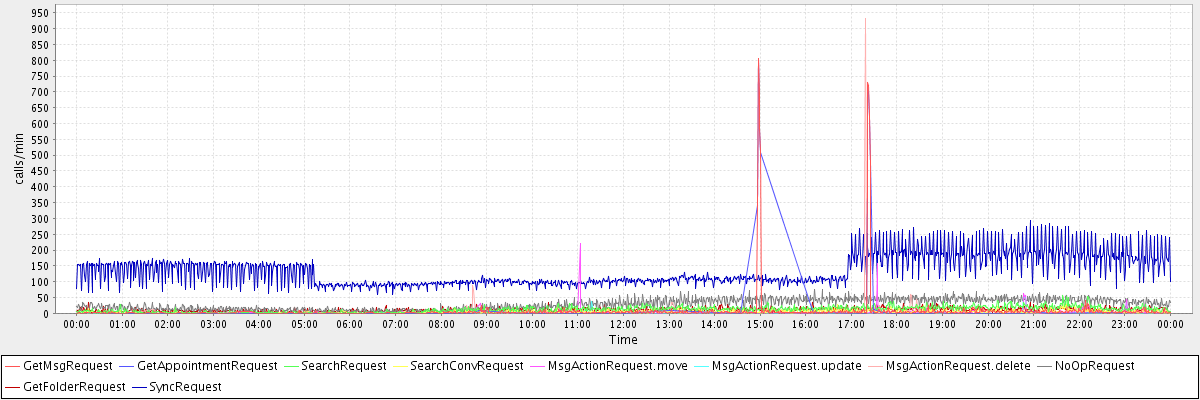 max(GetMsgRequest) = 804.00 max(GetAppointmentRequest) = 800.00 max(SearchRequest) = 57.00 max(SearchConvRequest) = 33.00 max(MsgActionRequest.move) = 221.00 max(MsgActionRequest.update) = 58.00 max(MsgActionRequest.delete) = 931.00 max(NoOpRequest) = 74.00 max(GetFolderRequest) = 39.00 max(SyncRequest) = 293.00