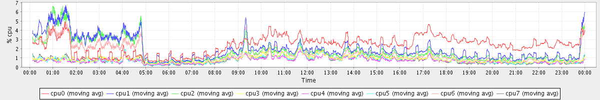 avg(cpu0) = 1.41 avg(cpu1) = 0.30 avg(cpu2) = 0.28 avg(cpu3) = 0.13 avg(cpu4) = 0.11 avg(cpu5) = 0.12 avg(cpu6) = 0.23 avg(cpu7) = 0.12