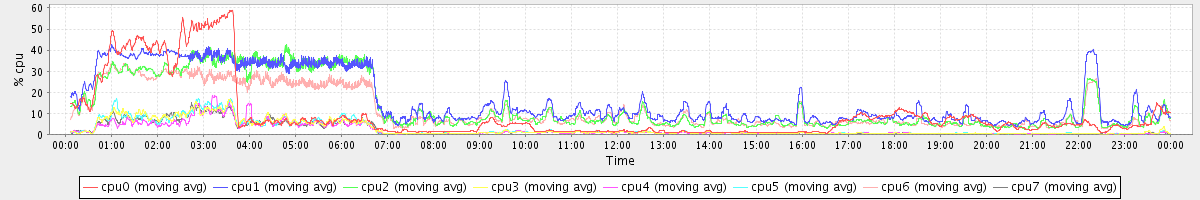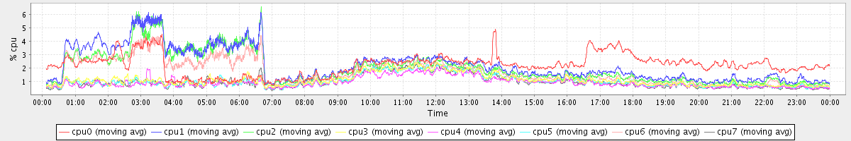 avg(cpu0) = 0.25 avg(cpu1) = 0.10 avg(cpu2) = 0.07 avg(cpu3) = 0.00 avg(cpu4) = 0.00 avg(cpu5) = 0.00 avg(cpu6) = 0.06 avg(cpu7) = 0.00