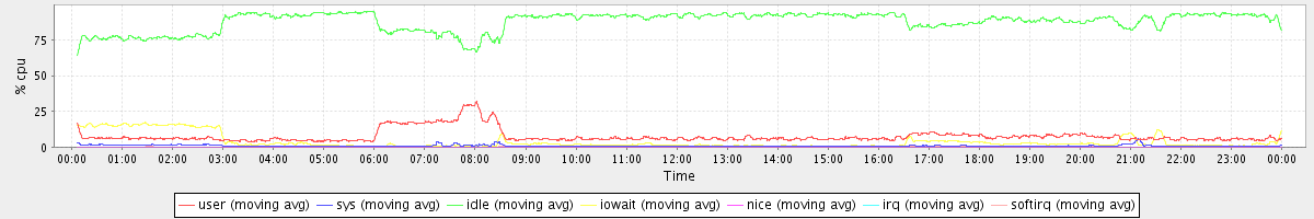 avg(user) = 7.55 avg(sys) = 0.83 avg(idle) = 87.79 avg(iowait) = 3.63 avg(nice) = 0.00 avg(irq) = 0.02 avg(softirq) = 0.18