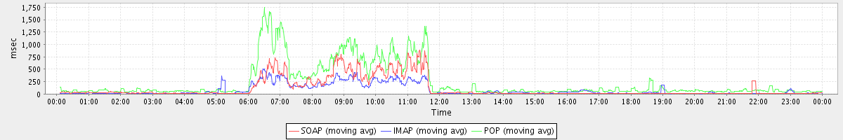 max(GetMsgRequest) = 29.00 max(GetAppointmentRequest) = 254.00 max(SearchRequest) = 71.00 max(GetContactsRequest) = 489.00 max(SearchConvRequest) = 64.00 max(GetInfoRequest) = 26.00 max(ConvActionRequest.trash) = 51.00 max(NoOpRequest) = 43.00 max(GetFolderRequest) = 298.00 max(SyncRequest) = 101.00