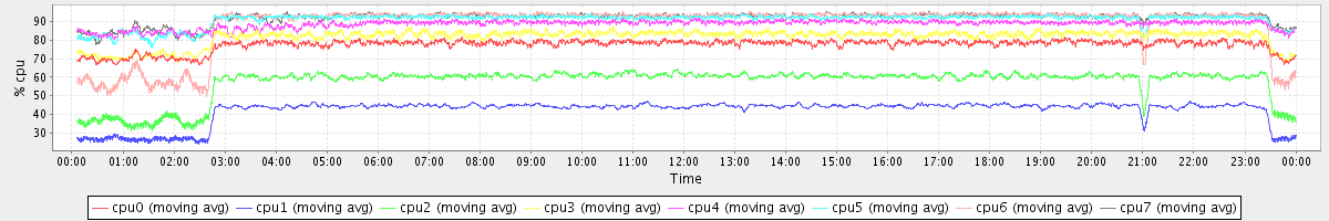 avg(cpu0) = 77.54 avg(cpu1) = 42.00 avg(cpu2) = 57.35 avg(cpu3) = 81.86 avg(cpu4) = 88.69 avg(cpu5) = 91.10 avg(cpu6) = 88.65 avg(cpu7) = 92.10