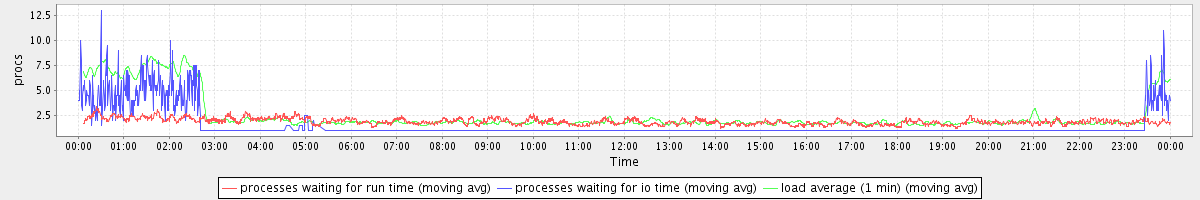 avg(processes waiting for run time) = 1.88 avg(processes waiting for io time) = 0.67 avg(load average (1 min)) = 2.50