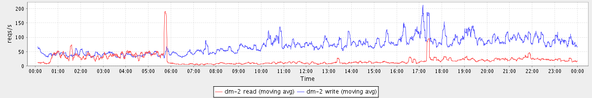 avg(dm-1 read) = 22.14 avg(dm-1 write) = 549.33