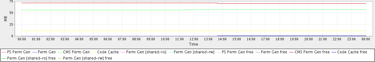avg(PS Perm Gen) = 0.00 avg(Perm Gen) = 0.00 avg(CMS Perm Gen) = 56.94 avg(Code Cache) = 11.26 avg(Perm Gen [shared-ro]) = 0.00 avg(Perm Gen [shared-rw]) = 0.00 avg(PS Perm Gen free) = 0.00 avg(Perm Gen free) = 0.00 avg(CMS Perm Gen free) = 71.06 avg(Code Cache free) = 0.30 avg(Perm Gen [shared-ro] free) = 0.00 avg(Perm Gen [shared-rw] free) = 0.00