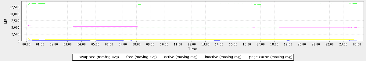 avg(swapped) = 0.25 avg(free) = 286.98 avg(active) = 13633.52 avg(inactive) = 521.63 avg(page cache) = 5202.79
