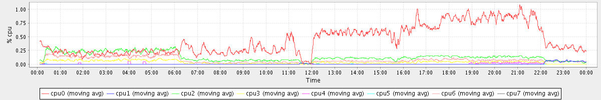 avg(cpu0) = 2.85 avg(cpu1) = 0.23 avg(cpu2) = 0.31 avg(cpu3) = 0.26 avg(cpu4) = 0.17 avg(cpu5) = 0.23 avg(cpu6) = 0.23 avg(cpu7) = 0.21