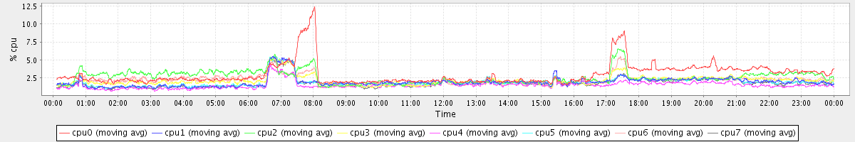 avg(cpu0) = 3.23 avg(cpu1) = 0.58 avg(cpu2) = 0.53 avg(cpu3) = 0.60 avg(cpu4) = 0.42 avg(cpu5) = 0.58 avg(cpu6) = 0.45 avg(cpu7) = 0.53