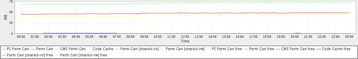 avg(PS Perm Gen) = 0.00 avg(Perm Gen) = 0.00 avg(CMS Perm Gen) = 70.13 avg(Code Cache) = 41.57 avg(Perm Gen [shared-ro]) = 0.00 avg(Perm Gen [shared-rw]) = 0.00 avg(PS Perm Gen free) = 0.00 avg(Perm Gen free) = 0.00 avg(CMS Perm Gen free) = 46.79 avg(Code Cache free) = 0.21 avg(Perm Gen [shared-ro] free) = 0.00 avg(Perm Gen [shared-rw] free) = 0.00