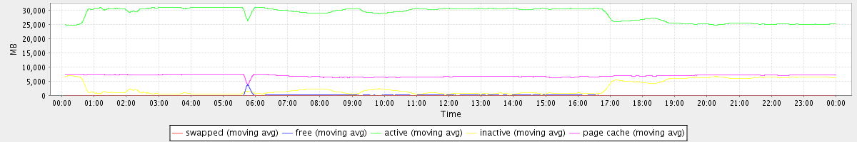 avg(swapped) = 0.25 avg(free) = 116.88 avg(active) = 28693.84 avg(inactive) = 2603.01 avg(page cache) = 6901.33