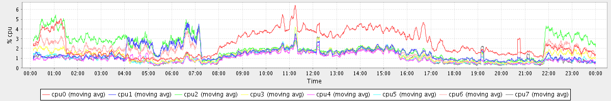 avg(cpu0) = 9.32 avg(cpu1) = 12.05 avg(cpu2) = 24.38 avg(cpu3) = 9.49 avg(cpu4) = 6.04 avg(cpu5) = 6.92 avg(cpu6) = 18.78 avg(cpu7) = 7.12
