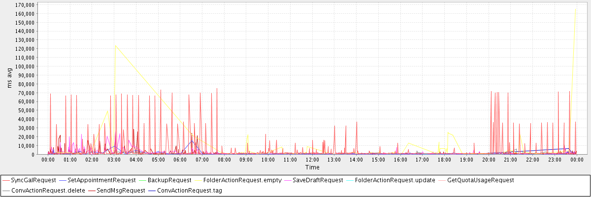 avg(SyncGalRequest) = 4064.71 avg(SetAppointmentRequest) = 409.62 avg(BackupRequest) = 1184.00 avg(FolderActionRequest.empty) = 8609.97 avg(SaveDraftRequest) = 771.76 avg(FolderActionRequest.update) = 434.00 avg(GetQuotaUsageRequest) = 3048.00 avg(ConvActionRequest.delete) = 747.45 avg(SendMsgRequest) = 775.22 avg(ConvActionRequest.tag) = 773.43