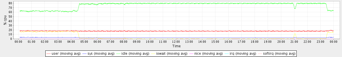 avg(user) = 17.48 avg(sys) = 2.85 avg(idle) = 75.79 avg(iowait) = 3.85 avg(nice) = 0.00 avg(irq) = 0.00 avg(softirq) = 0.02