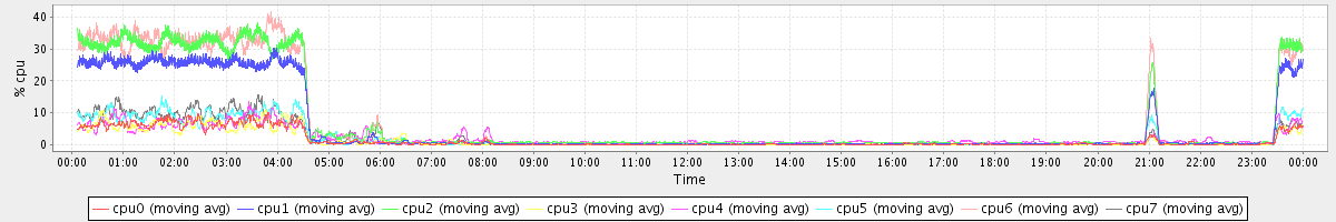 avg(cpu0) = 4.83 avg(cpu1) = 7.38 avg(cpu2) = 5.06 avg(cpu3) = 1.85 avg(cpu4) = 1.13 avg(cpu5) = 0.95 avg(cpu6) = 0.95 avg(cpu7) = 0.62