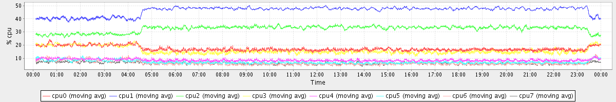 avg(cpu0) = 17.22 avg(cpu1) = 46.34 avg(cpu2) = 32.36 avg(cpu3) = 15.83 avg(cpu4) = 8.50 avg(cpu5) = 7.06 avg(cpu6) = 6.30 avg(cpu7) = 6.18