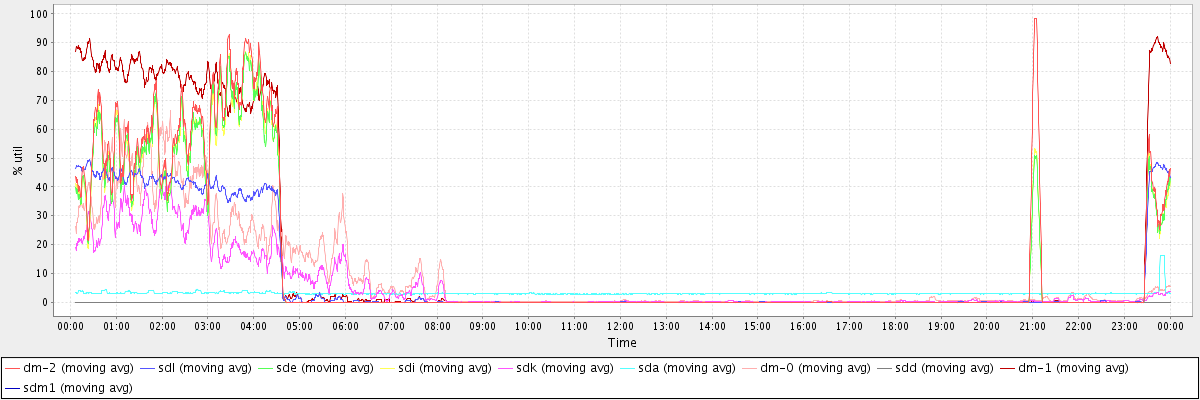 avg(dm-2) = 13.14 avg(sdl) = 9.04 avg(sde) = 11.93 avg(sdi) = 11.95 avg(sdk) = 5.98 avg(sda) = 3.11 avg(dm-0) = 9.34 avg(sdd) = 0.00 avg(dm-1) = 16.96 avg(sdm1) = 0.00