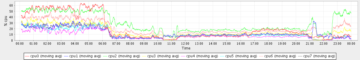 avg(cpu0) = 46.19 avg(cpu1) = 70.67 avg(cpu2) = 39.20 avg(cpu3) = 64.10 avg(cpu4) = 78.25 avg(cpu5) = 73.61 avg(cpu6) = 54.68 avg(cpu7) = 72.34