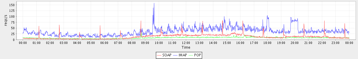 Host zm03.stanford.edu: Mailboxd: Request Rate by Client Protocol