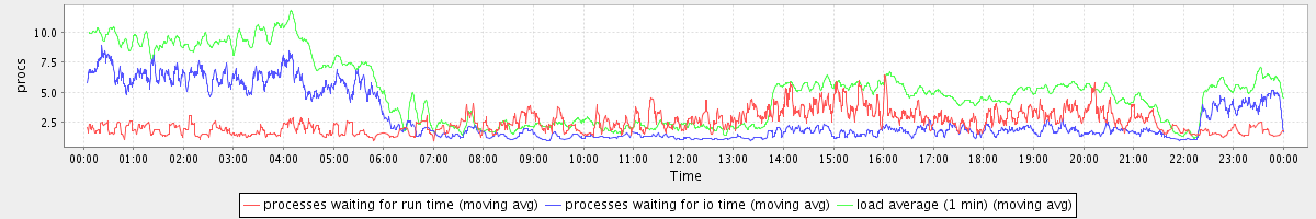 avg(processes waiting for run time) = 1.85 avg(processes waiting for io time) = 2.46 avg(load average (1 min)) = 5.07