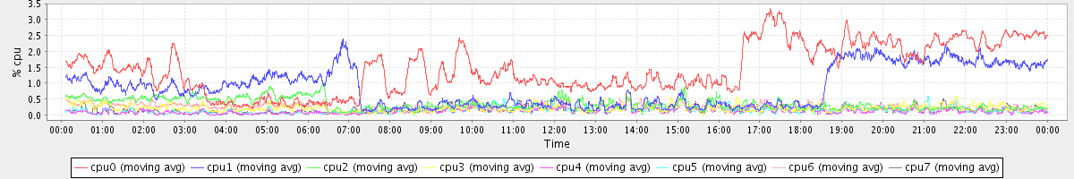 avg(cpu0) = 1.44 avg(cpu1) = 0.85 avg(cpu2) = 0.34 avg(cpu3) = 0.22 avg(cpu4) = 0.13 avg(cpu5) = 0.14 avg(cpu6) = 0.25 avg(cpu7) = 0.16