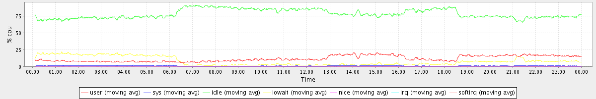 avg(user) = 11.73 avg(sys) = 1.08 avg(idle) = 78.88 avg(iowait) = 7.99 avg(nice) = 0.00 avg(irq) = 0.03 avg(softirq) = 0.29