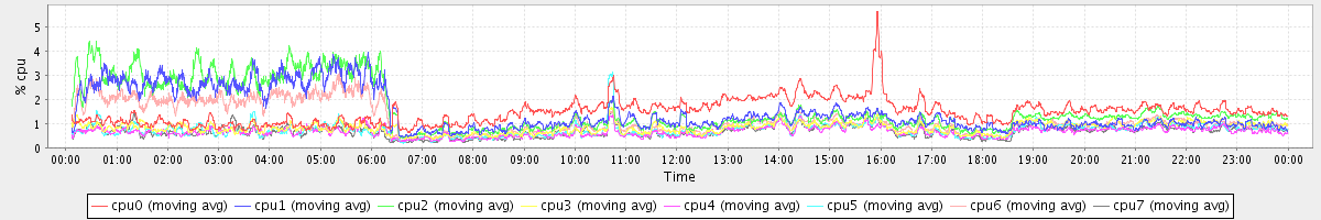 avg(cpu0) = 1.10 avg(cpu1) = 0.24 avg(cpu2) = 0.27 avg(cpu3) = 0.12 avg(cpu4) = 0.09 avg(cpu5) = 0.12 avg(cpu6) = 0.20 avg(cpu7) = 0.12