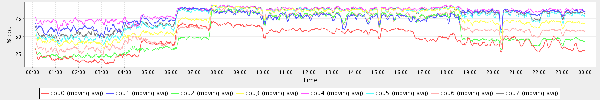 avg(cpu0) = 45.28 avg(cpu1) = 76.46 avg(cpu2) = 56.05 avg(cpu3) = 71.63 avg(cpu4) = 84.09 avg(cpu5) = 76.90 avg(cpu6) = 62.75 avg(cpu7) = 78.74